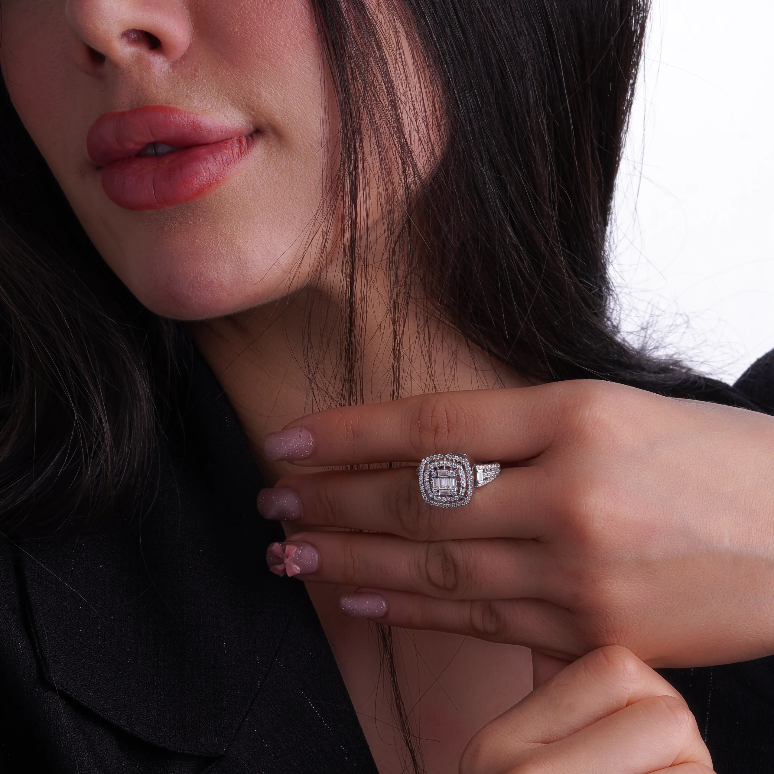 این انگشتر نقره با طراحی کلاسیک لوکس، جلوهای الهامگرفته از جواهرات فاخر اروپایی دارد. نگینهای زیرکونیای باگت که بهصورت منظم در مرکز چیدمان شدهاند، در کنار نگینهای ریز میکروست اطراف، درخششی عمیق و چندلایه ایجاد کردهاند.