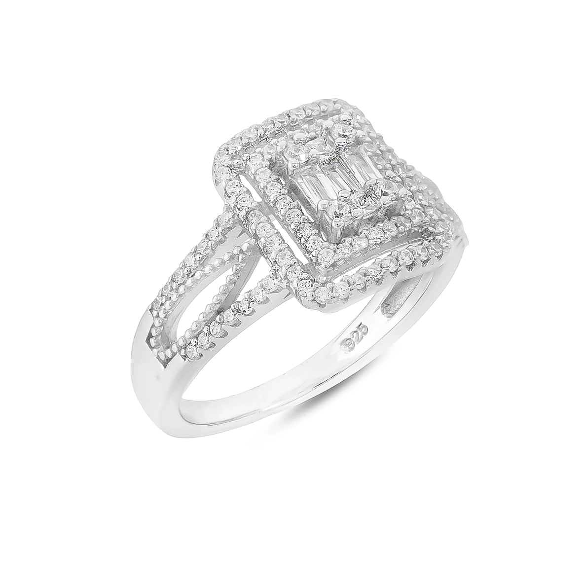 انگشتر نقره زنانه با طراحی هالهای، نگینهای زیرکنیا با برش باگت و رکاب نگینکاریشده، انتخابی درخشان برای استایلهای مجلسی.