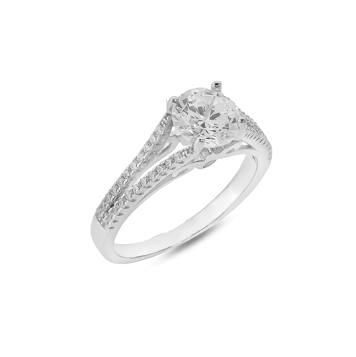 نگین مرکزی گرد از جنس زیرکنیا سفید با پایهی چندچنگ، در مرکز انگشتر قرار گرفته و بهواسطهی نگینهای ریز کارشده روی شانههای رکاب، جلوهای درخشانتر و لوکستر پیدا کرده است. طراحی کشیدهی رکاب باعث میشود انگشتر روی دست ظریفتر دیده شود و تمرکز اصلی روی نگین مرکزی باقی بماند.