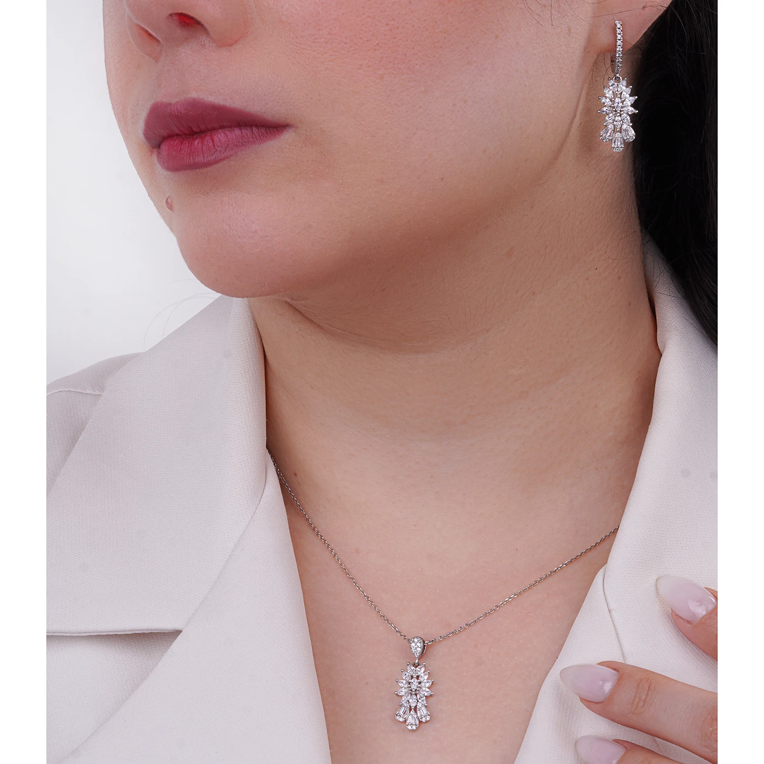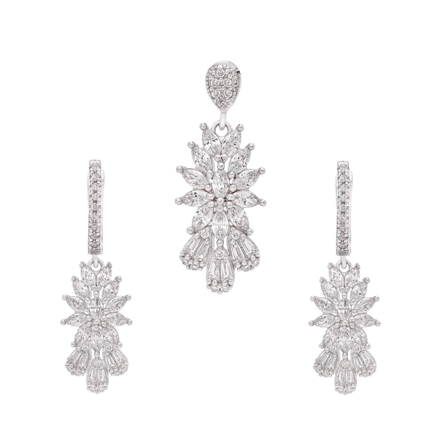 پلاک این نیمست با ترکیب منظم سنگهای تراشخورده، جلوهای شاهانه و بسیار زنانه دارد و گوشوارهها نیز با آویز کلاسیک و برقزن خود، چهرهای جذاب و متفاوت میسازند. آبکاری رودیوم، این کار را در برابر سیاهی مقاوم کرده و جلوهی طلای سفید را به آن بخشیده است.