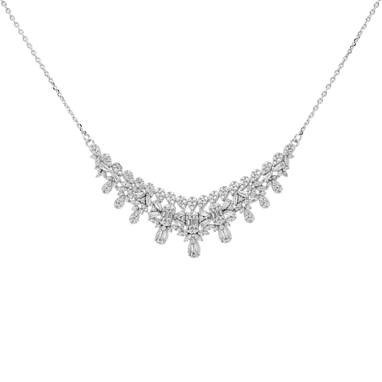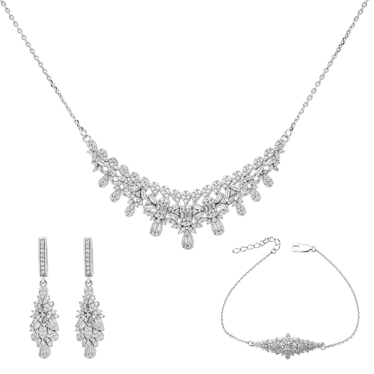 این سرویس نقره فاخر با طراحی باشکوه و سنگچینی چندلایه، تلفیقی از هنر کلاسیک و ظرافت مدرن است. گردنبند با آرایهای از نگینهای باگت، مارکیز و اشکی، جلوهای شبیه شکوفههای الماسی ایجاد کرده و گوشوارهها با همان ساختار درخشان، این زیبایی را کامل میکنند.