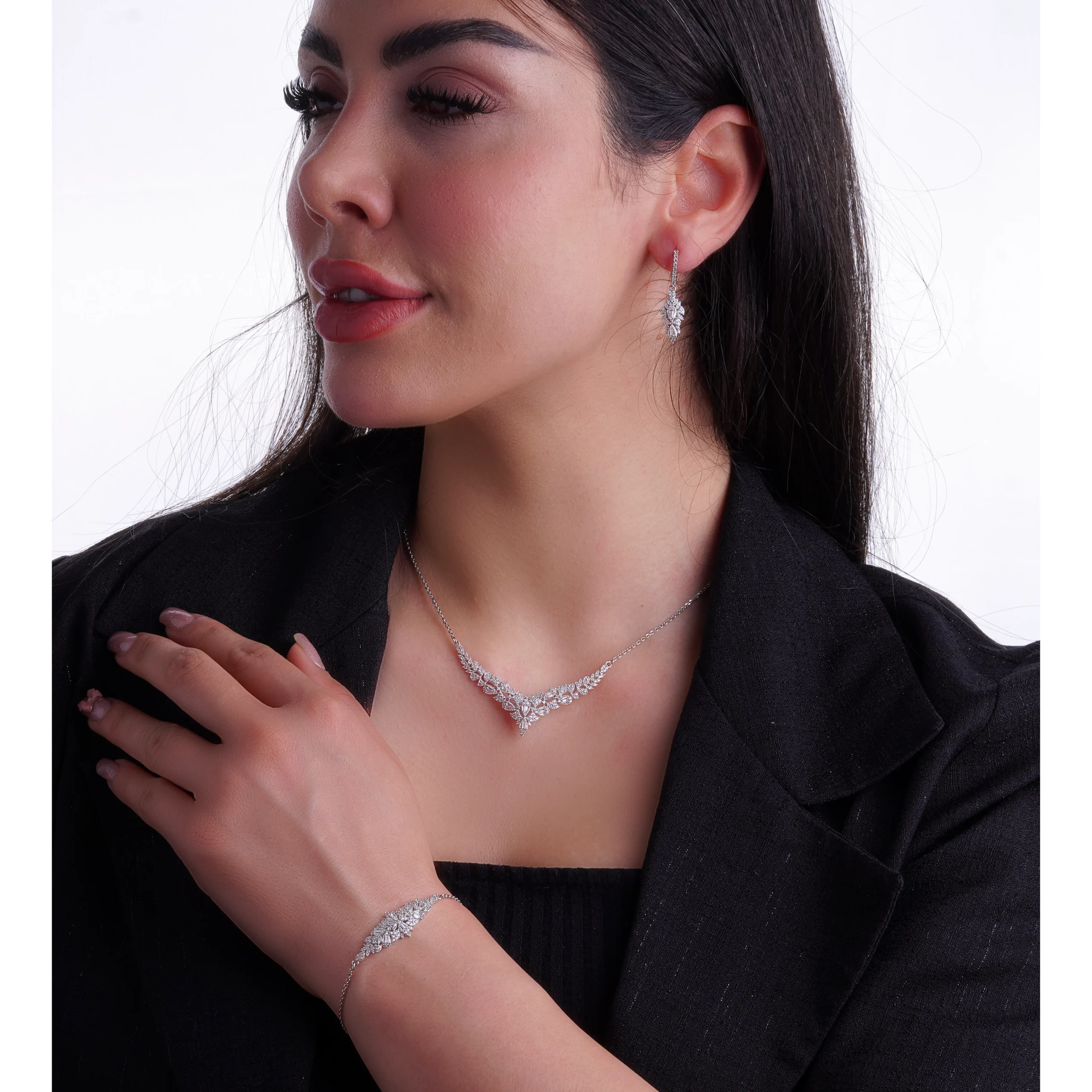 گردنبند این سرویس با قوس V-شکل و عناصر برگگونه، فرم چهره را کشیدهتر و ظریفتر نشان میدهد؛ گوشوارهها طراحی آبشاری دارند و دستبند نیز با همان سبک کلاسیک-لاکچری تکمیلکننده این ست است.