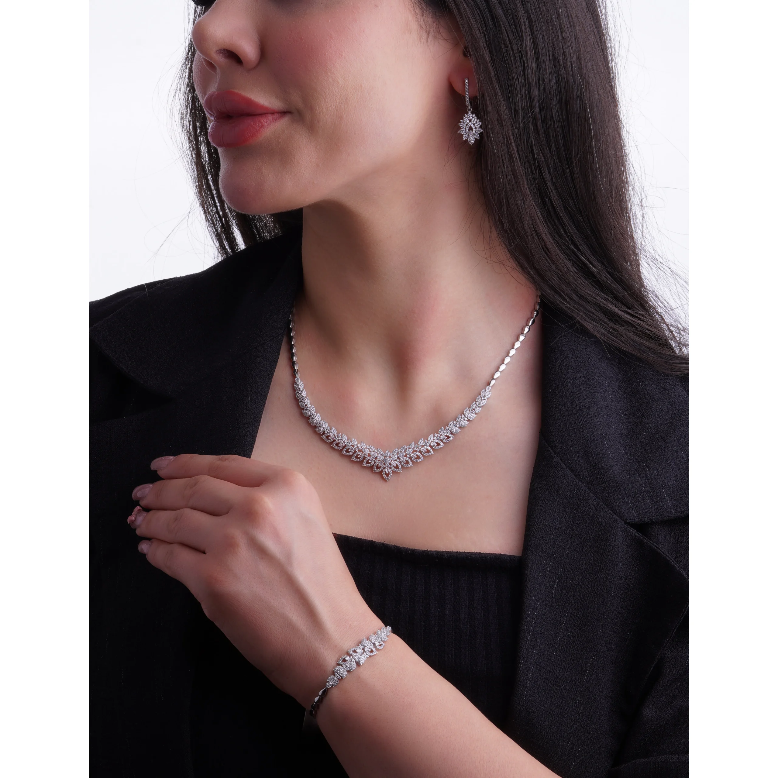 سرویس نقره 925 شمیم سیلور مدل 1015128 با نگینهای زیرکونیا و طراحی لوکس، مناسب مجالس رسمی و هدیهای ارزشمند.