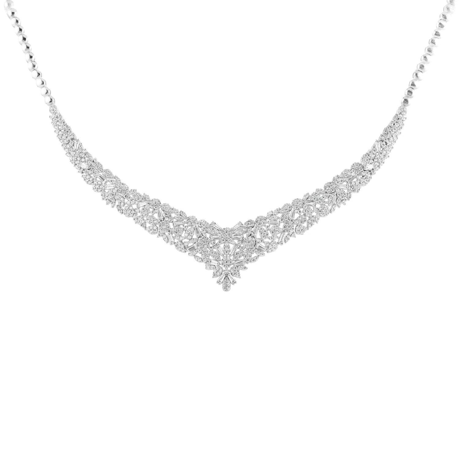 گردنی با فرم V کلاسیک روی خط گردن مینشیند و مرکز توجه را به سمت یقه هدایت میکند.