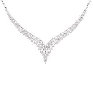 طراحی گردنبند به فرم V کلاسیک است که بهزیبایی روی خط یقه مینشیند و به کمک تراکم بالای نگینها جلوهای کریستالی و چندوجهی ایجاد میکند.