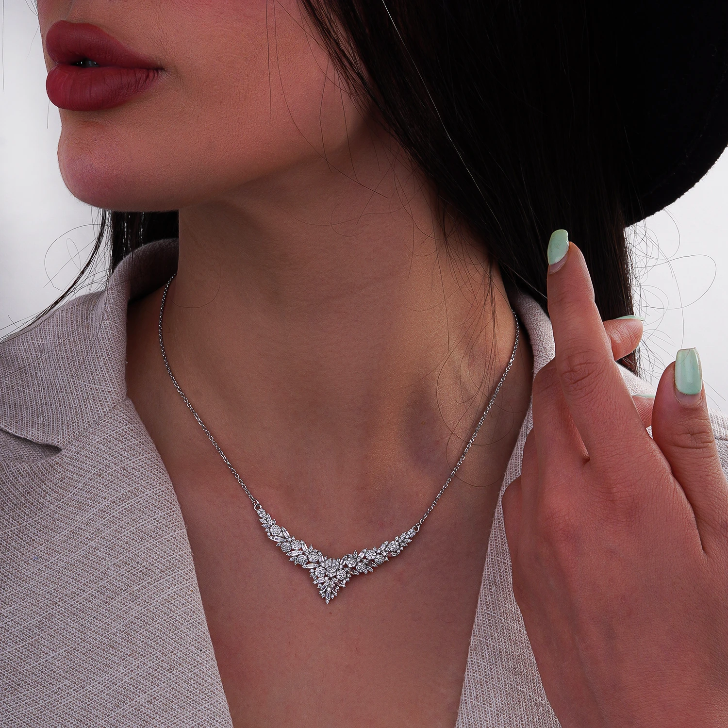 سرویس نقره زنانه شمیم سیلور مدل 101572 با طراحی الهامگرفته از شکوفههای الماسی، جلوهای چشمگیر و کاملاً مجلسی ایجاد میکند. ترکیب نگینهای باگت و برلیان تراش در کنار چیدمان چندلایه باعث شده این سرویس مانند یک قطعه جواهر واقعی بدرخشد.
