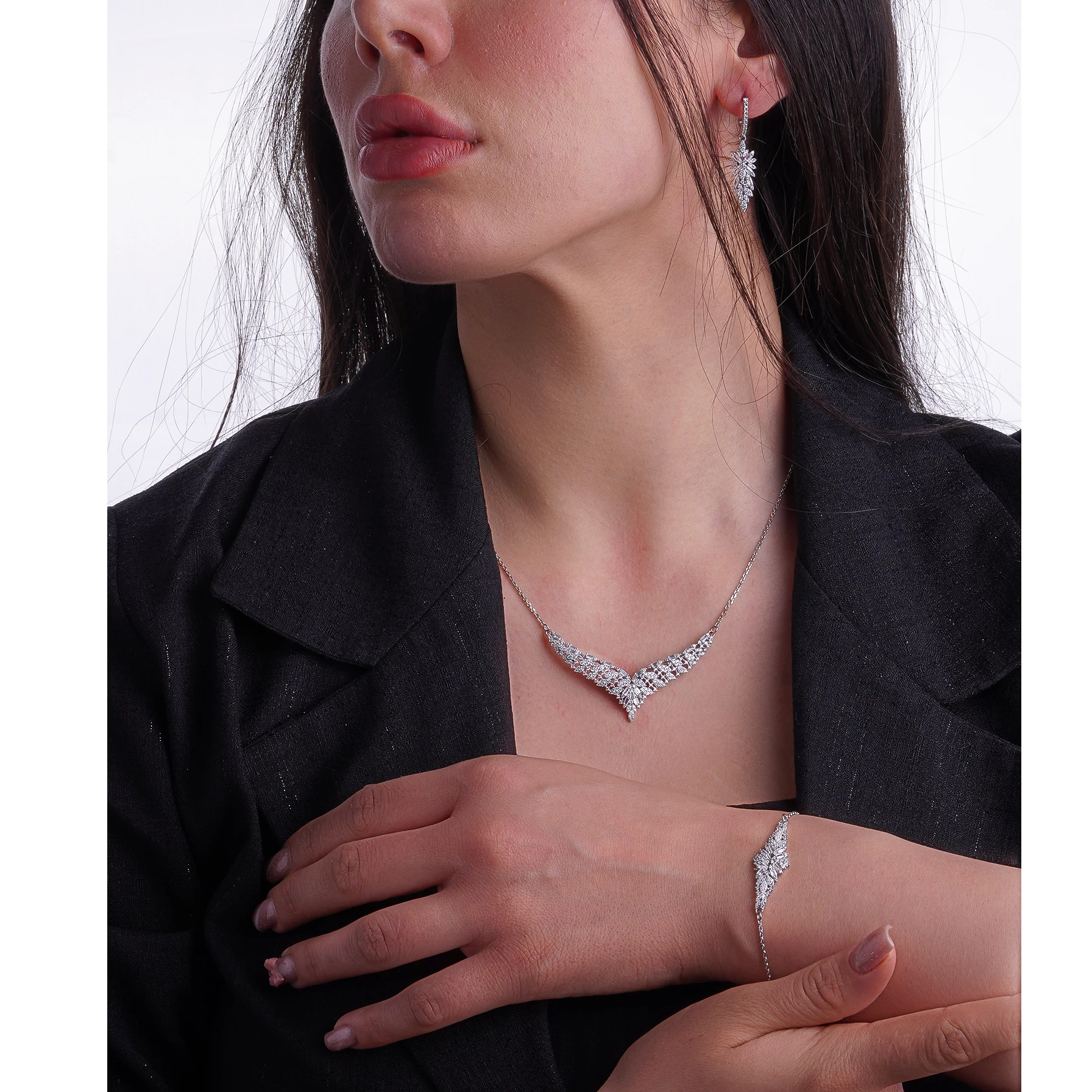 گوشوارههای آویز با تراشهای متعدد سنگ، حرکت نور را چندبرابر کرده و در هر زاویهای برق خیرهکنندهای ایجاد میکنند. دستبند ظریف این ست نیز با پلاک مرکزی هماهنگ، تکمیلکننده این سرویس لوکس است.