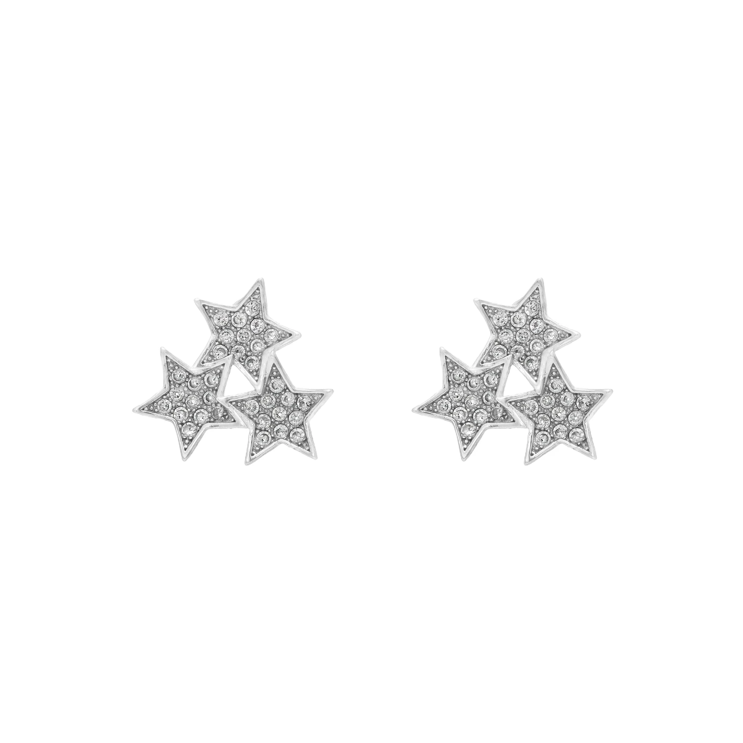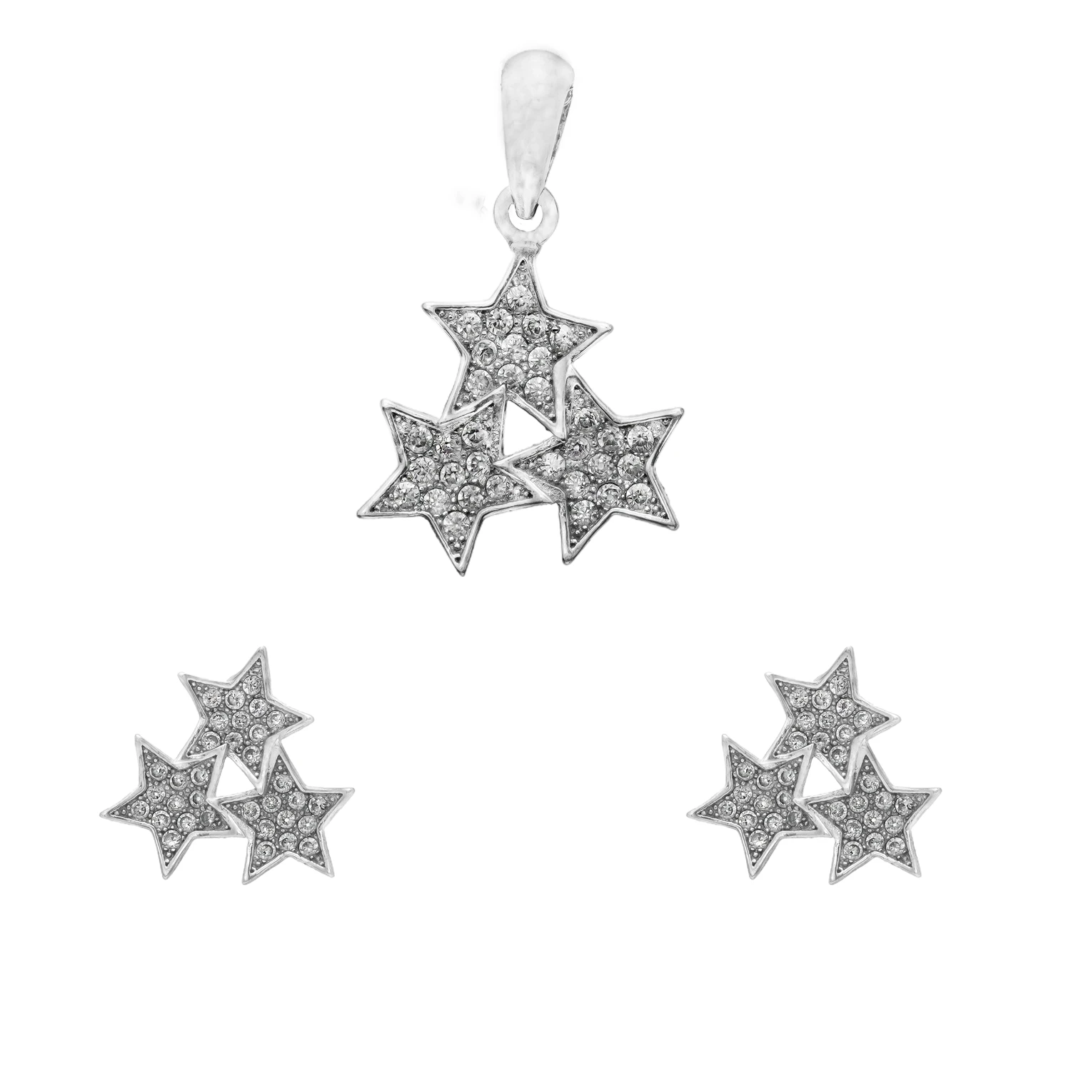 ست نقره ۹۲۵ شامل پلاک و گوشواره طرح سهستاره با نگینکاری میکروست. درخشان، ظریف و مناسب استایل دخترانه و هدیه دادن. خرید آنلاین از شميمسيلور.