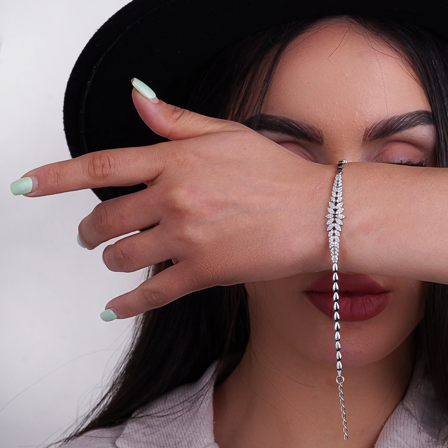 سنگهای زیرکونیای سفید با تکنیک میکروست روی دستبند نصب شدهاند که باعث درخشش بسیار بالا، مشابه الماس واقعی میشود. ترکیب طرح برگ با اتصالهای براق نقرهای، این دستبند را هم برای استفاده روزمره مجلسی مناسب کرده و هم گزینهای شیک برای مهمانیها، عروسیها و موقعیتهای خاص است.