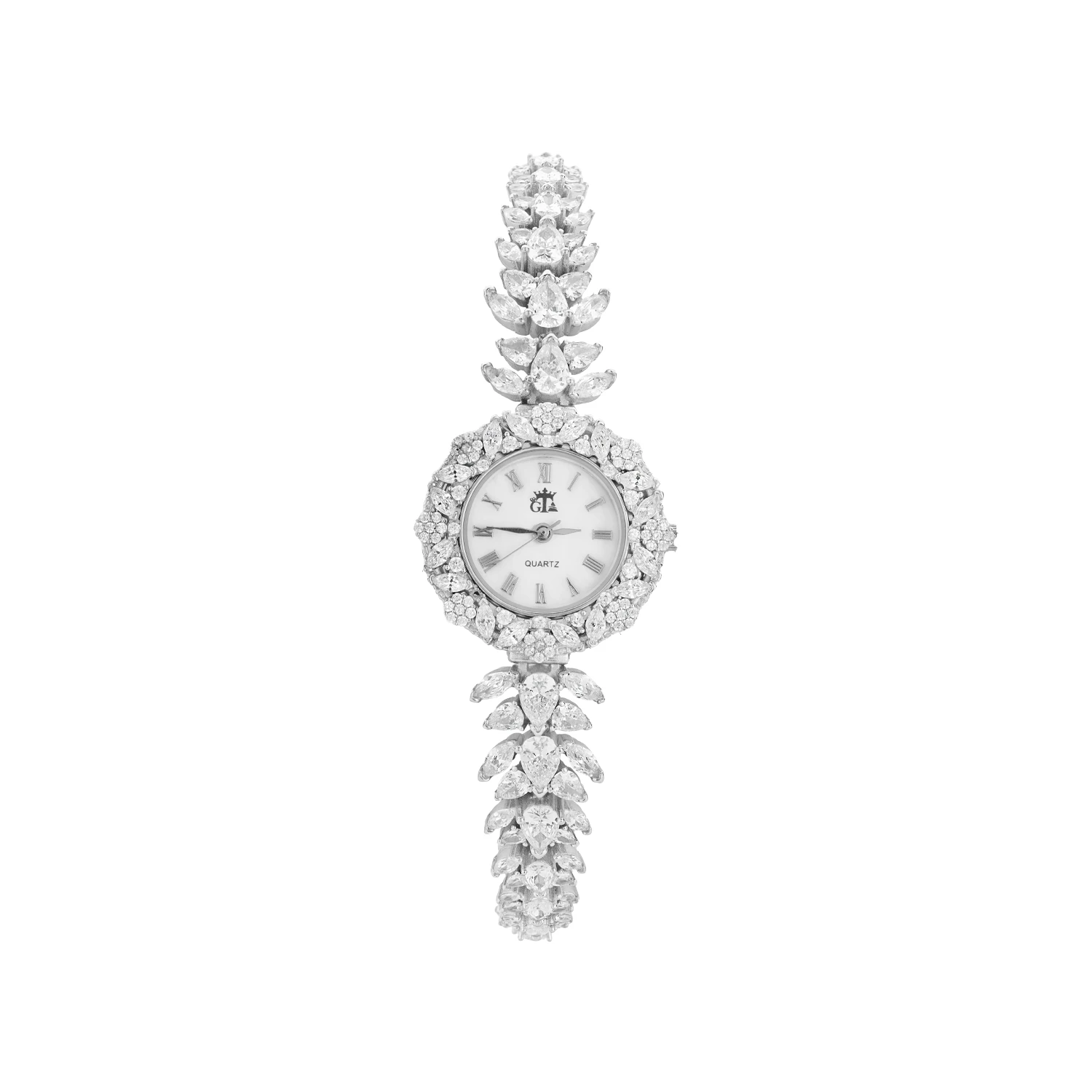 این ساعت نقره زنانه 925 با طراحی الهامگرفته از فرمهای برگ و قطره، بیشتر شبیه یک دستبند جواهری روی دست مینشیند تا یک ساعت معمولی. قاب گرد با صفحه کلاسیک و اعداد رومی، در مرکز قرار گرفته و اطراف آن با یک هاله درخشان از ریزنگینهای زیرکونیا پوشیده شده است؛ چیدمانی که نور را نرم و یکدست پخش میکند و جلوهای لوکس اما ظریف میسازد.